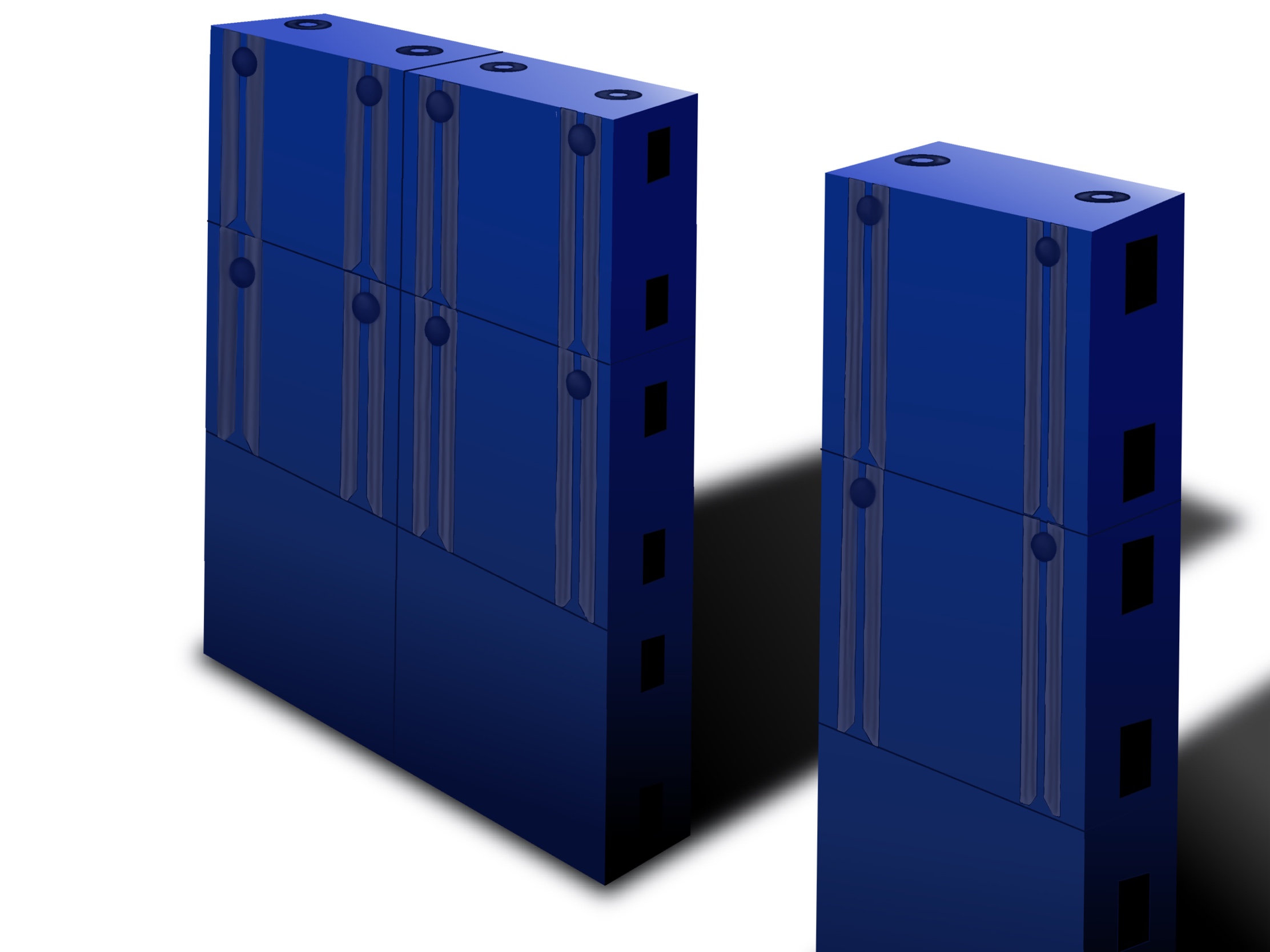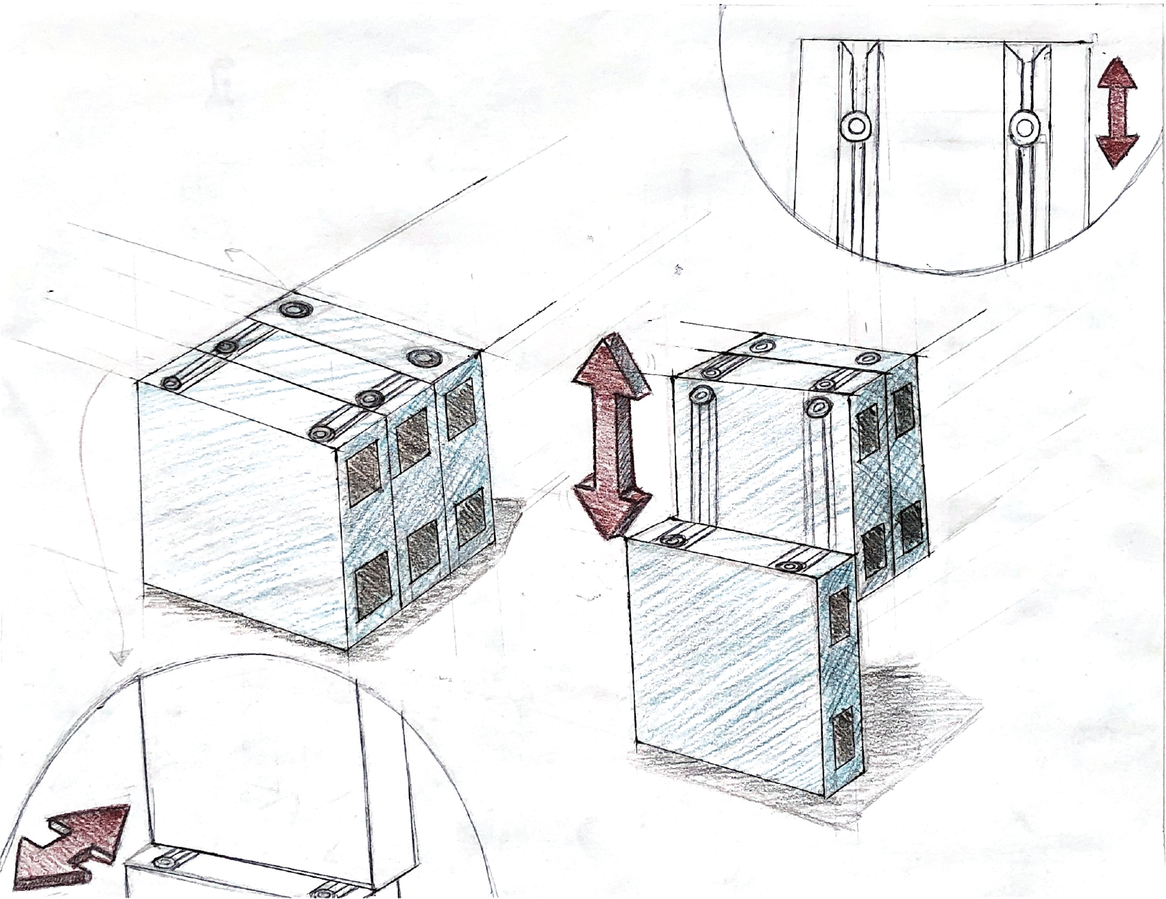 Hay dos tipos de módulos, el extremo que es el que va pegado a la pared y cuenta con chupones de pvc en un lateral para poder fijarse a la pared y en el otro imanes para conectarse con otros módulos y el central que en ambos lados cuenta con imanes para conectarse. Cada módulo está compuesto por 3 piezas de espuma aislante de poliuretano de 1 mt x 1 mt x .065 mts recubierta de polietileno de 19 MM, cada pieza cuenta con su respectivo mecanismo deslizante de aluminio, chupones de pvc e imanes para su óptimo armado.